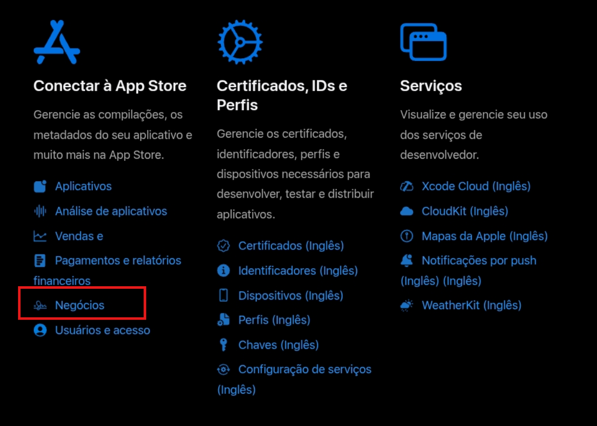Como o aplicativo envolve movimentações financeiras (como taxas de serviço ou vendas), a Apple exige um aceite adicional na plataforma de gerenciamento.