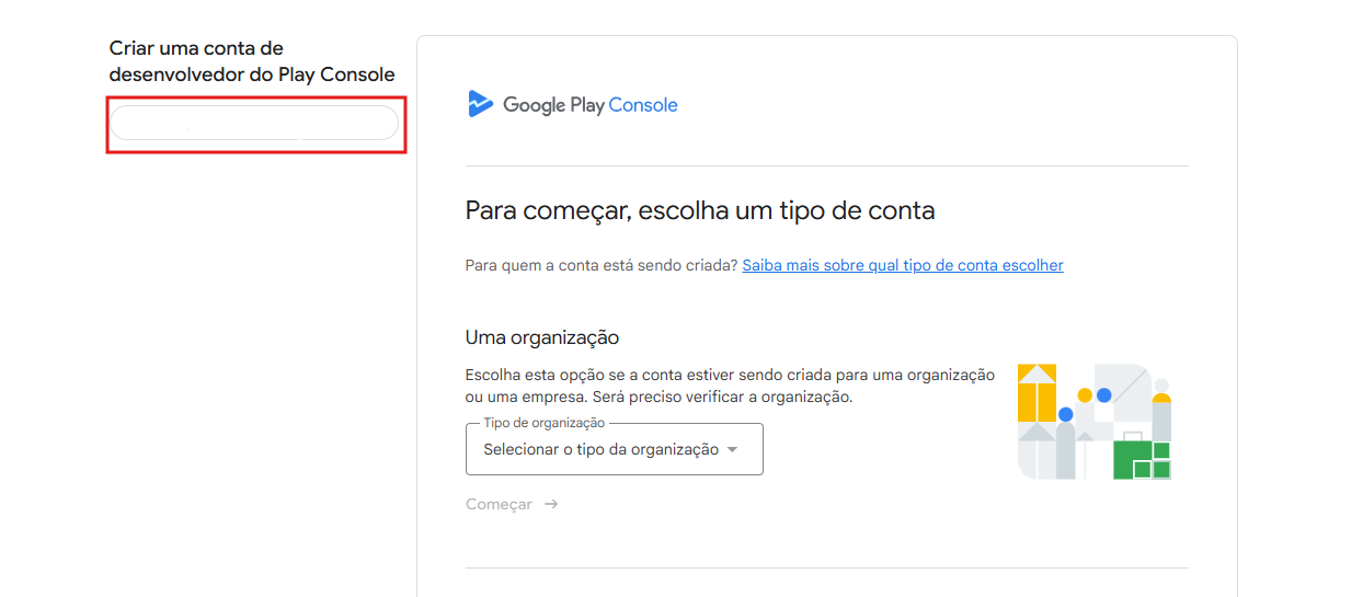 1️⃣ Acesse a Play Console pelo link https://play.google.com/console/signup