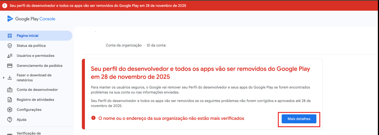 Ao acessar sua conta no Google Play Console, você verá o alerta da Google destacado em vermelho.