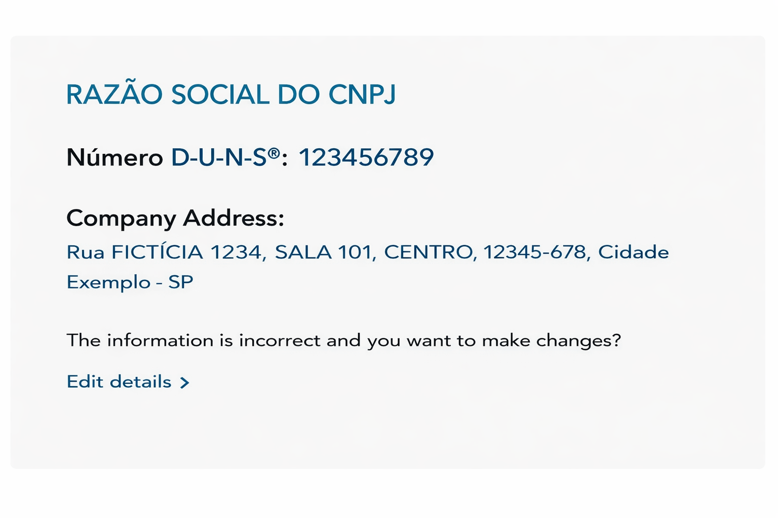 🔹 Se os dados de nome e endereço estiverem diferentes dos dados do CNPJ, isso significa que o DUNS está desatualizado na base da Dun & Bradstreet.