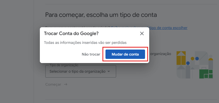 Clique no ícone indicado na imagem (quadrado circulado em vermelho) e selecione a opção “Mudar de conta”.