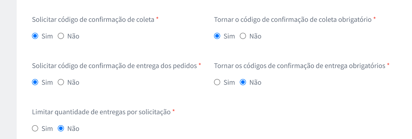 Além disso, caso deseje que o preenchimento do código seja obrigatório para entregador concluir a entrega, basta marcar a opção "SIM" em "Tornar o código de confirmação de entrega obrigatórios".