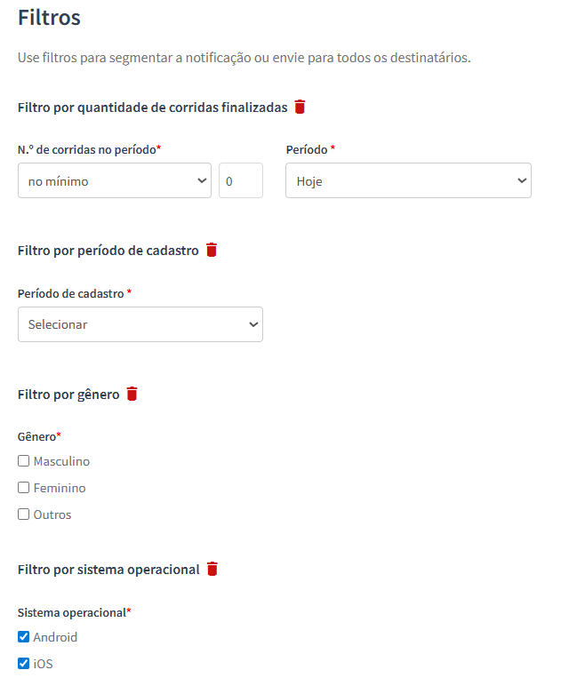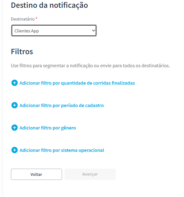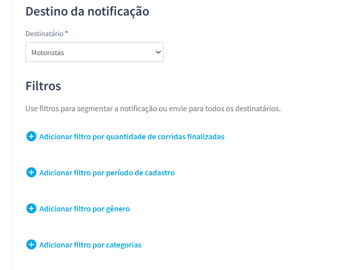 Ao segmentar clientes por filial ou matriz, a opção "Nenhuma corrida" não estará disponível. Isso ocorre porque um cliente só é vinculado a uma filial após realizar uma corrida com um motorista dessa unidade.