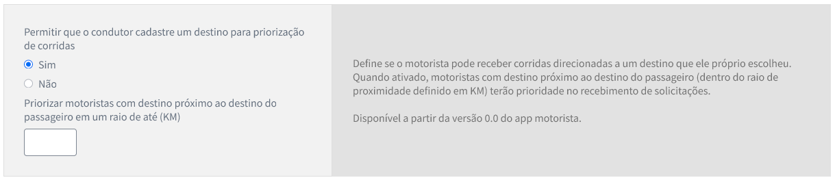 Para configurar, acesse: Configurações > Gerais > Motorista > Permitir que o condutor cadastre um destino para priorização de corridas.