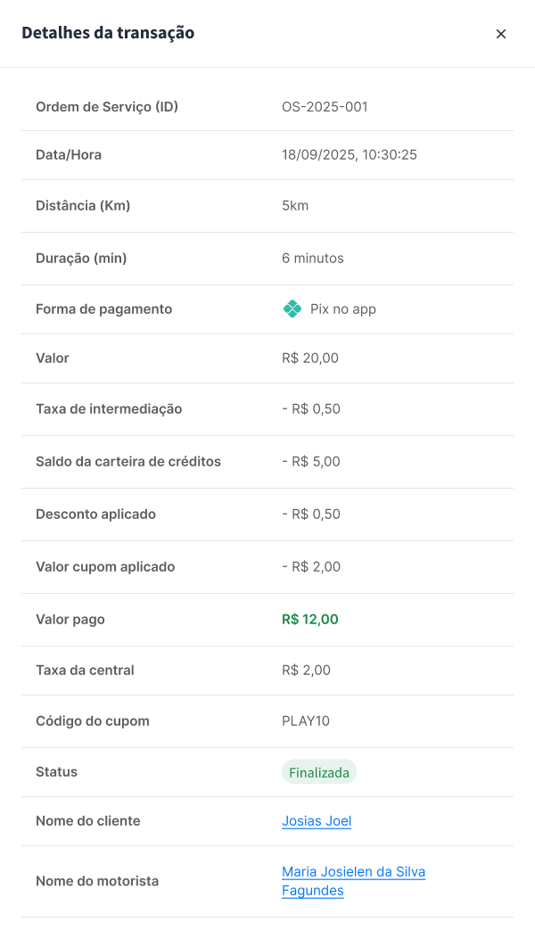 Informações de linha: A tabela exibe diretamente a data/hora, forma de pagamento, valor total, taxa da central e o status da corrida.