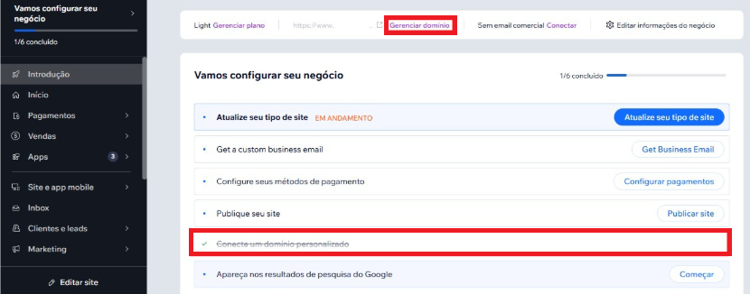 ⚠️ Importante: o domínio precisa estar conectado e ativo no site.