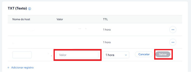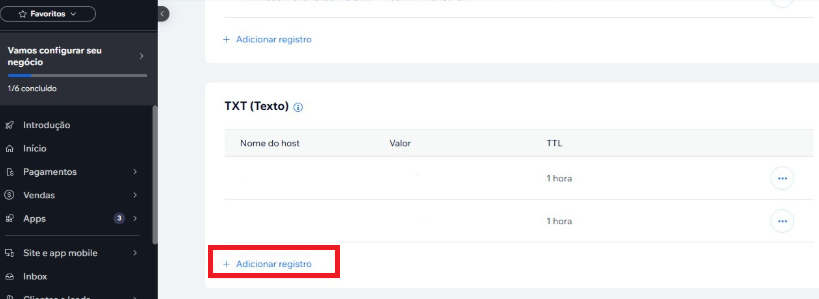 Agora vamos adicionar o registro TXT dentro da plataforma da Wix.