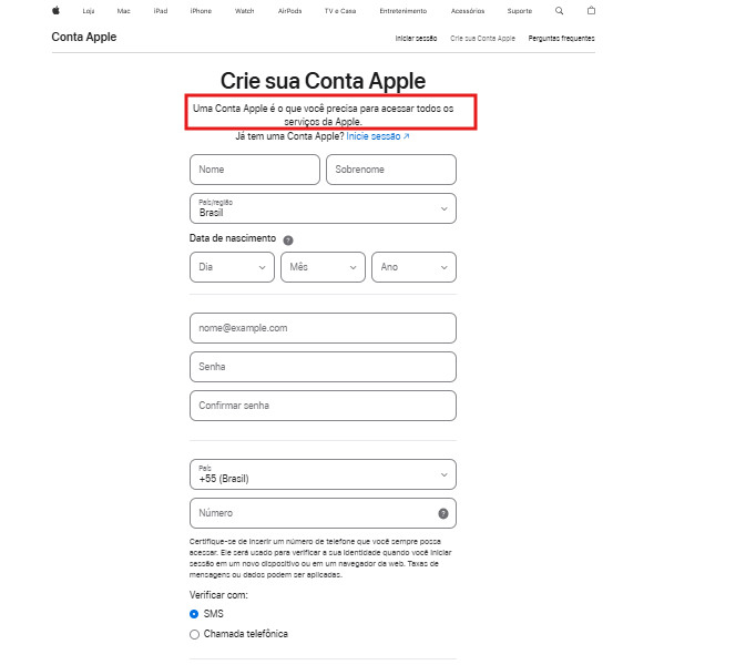 “Olá, eu me chamo (seu nome) e estou tentando criar uma Conta Apple, mas no campo (informe exatamente em qual etapa e campo ocorreu o erro) apareceu a seguinte mensagem (leia a mensagem exibida). Pode me ajudar?”