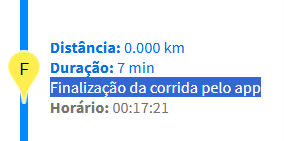 A indicação “Finalização da corrida pelo aplicativo” será exibida apenas quando a distância entre esses dois pontos for superior a 500 metros.