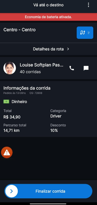 Durante o fluxo de finalização da corrida, existem dois momentos diferentes no aplicativo do condutor: