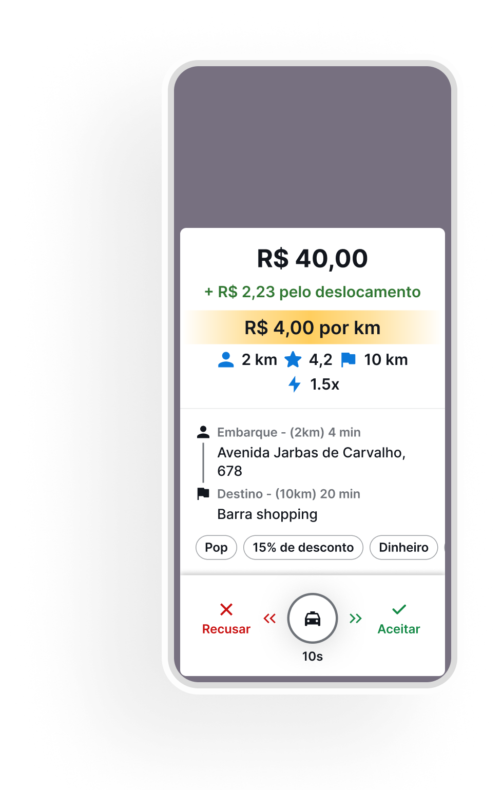 É possível visualizar o tempo estimado até o local de embarque do passageiro no momento da oferta da corrida.
