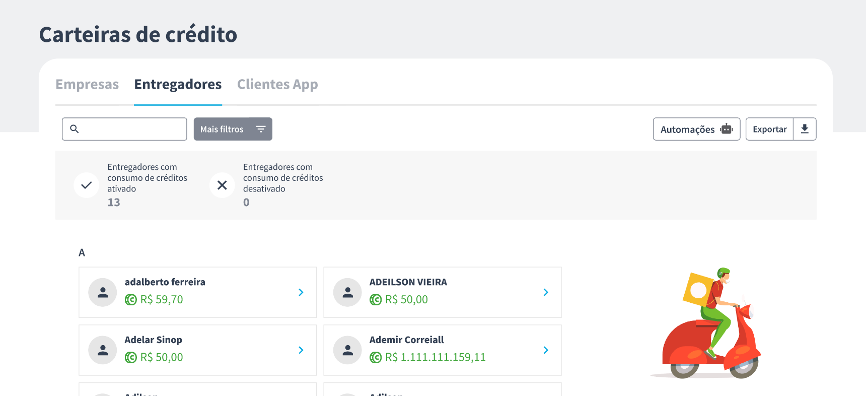 A Programação de ações periódicas nas carteiras permite que a Central automatize adições ou retiradas de crédito nas carteiras de entregadores e empresas, eliminando a necessidade de execuções manuais recorrentes pelos operadores.