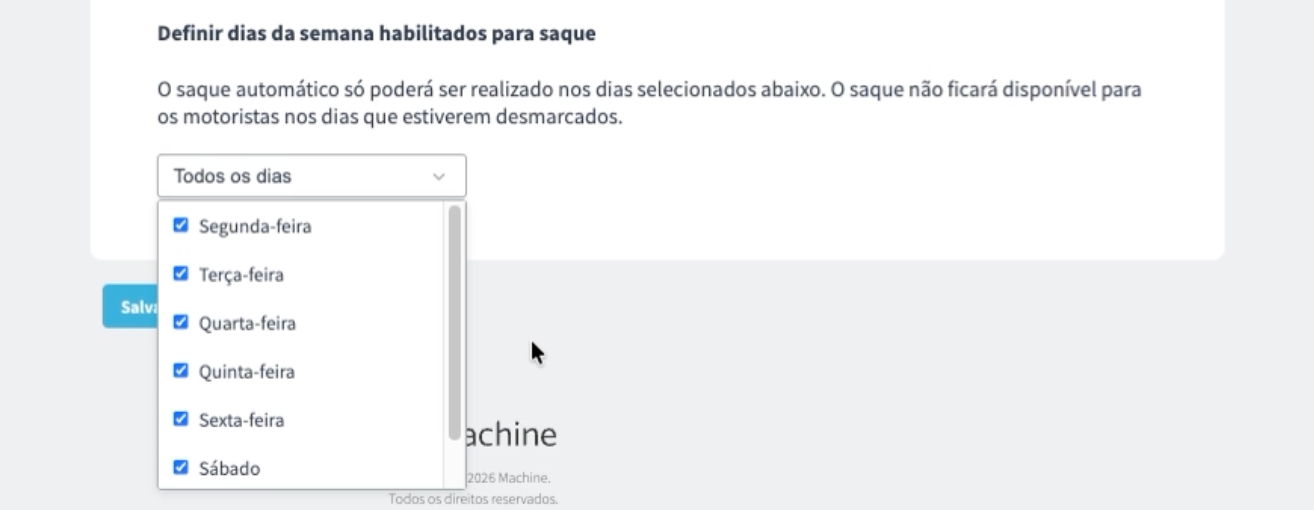 Ao ativar essa configuração, a central escolhe os dias da semana em que o saque via PIX ficará habilitado para os condutores.