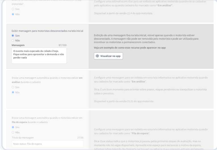 A funcionalidade de mensagem personalizada para condutores desconectados permite que a central exiba um texto configurável no aplicativo do condutor quando ele estiver desconectado.