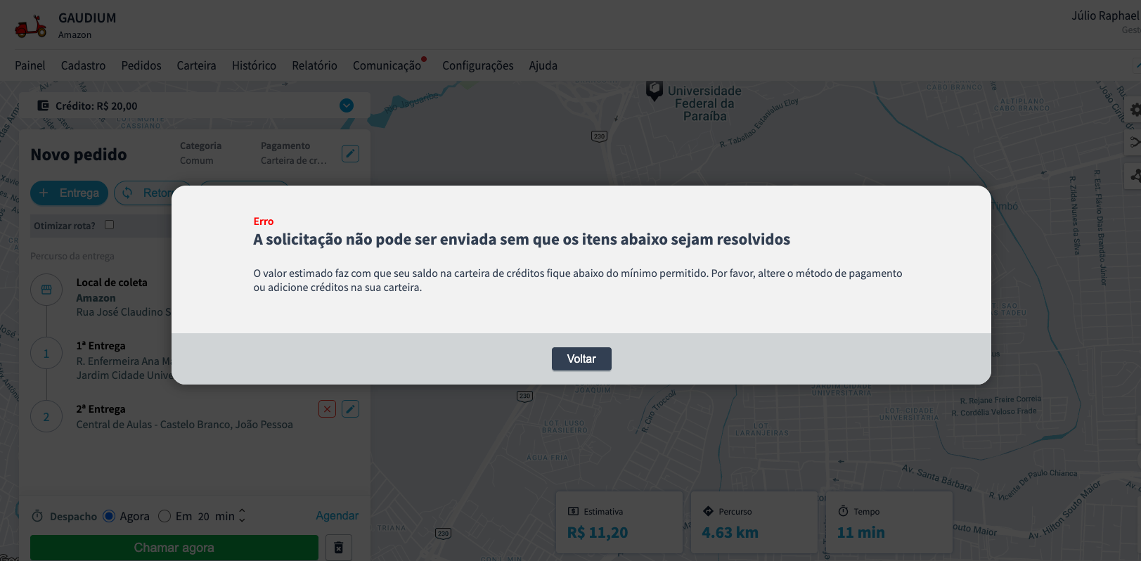 Para garantir um controle financeiro mais preciso, a plataforma conta com uma validação que impede que empresas agendem solicitações quando não há créditos suficientes disponíveis em carteira.