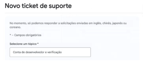 2. No campo Selecione um tópico escolha a opção “Conta de desenvolvedor e verificação”