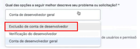 3. No segundo campo, escolha a opção “Exclusão da de desenvolvedor”
